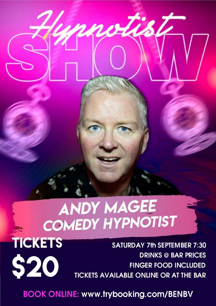 Hypnotic Comedian "Andy Magee" Saturday 7th of September - Border Inn Moama Andy Magee - Comedy hypnotist. A unique Comedy act with a mix of Andy's Stand-Up comedy and hilarious Hypnotised sketches https://youtu.be/l6Vlrw1mV3g EVENTS ON THE MURRAY â CREATING A REVOLUTION FORÂ TOURISM, TOURS, CONCERTS & EVENTS ON THE MURRAY RIVER!!!