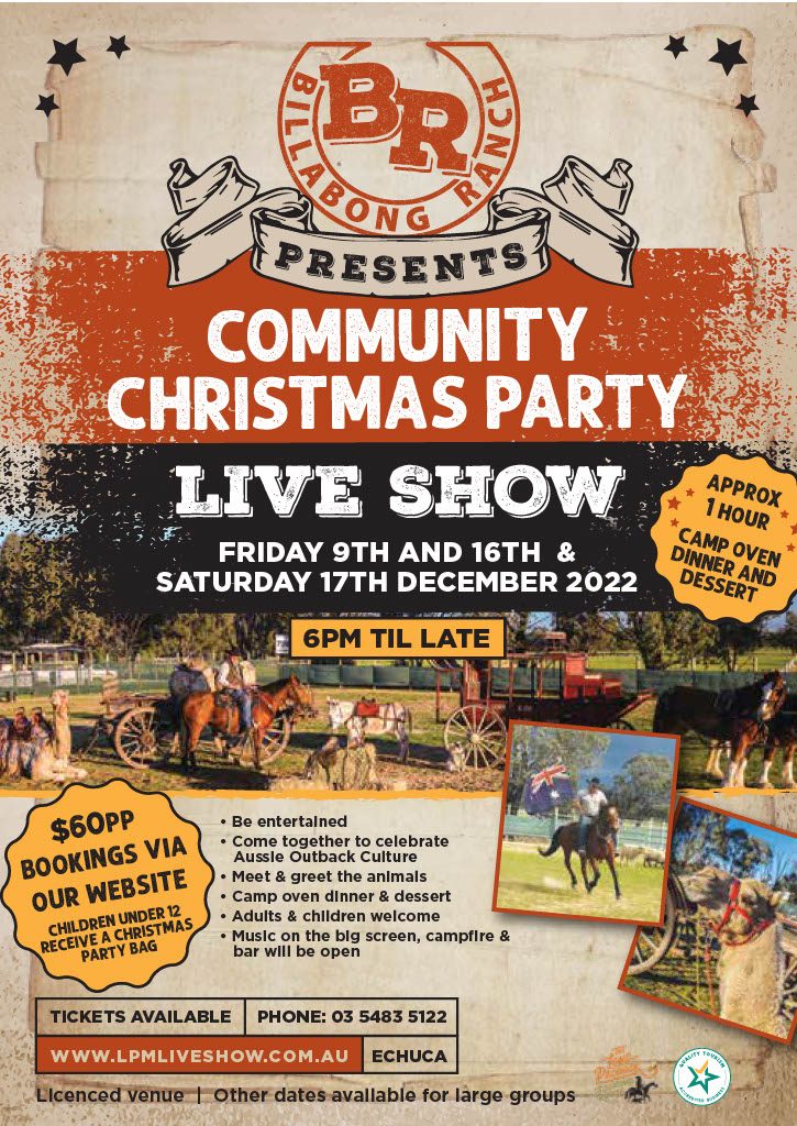 Friday 9th & 16th & Saturday the 17th of December. Join the crew at Billabong Ranch for the one hour live show followed by Camp Oven Dinner, Drover's Dessert & music on the Big Screen around the campfire. The bar will be open from 6pm. Be entertained as we come together to pay tribute to the Aussie outback, it's characters & it's cultures. Meet & greet the animals after the show then sit down to a traditional Camp Oven Stew…