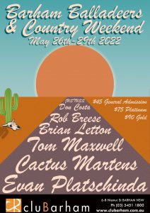 Barham Balladeers & Country Music Weekend A great weekend of Country Music right on the great Murray River! Featured Artists: Brian Letton, Tom Maxwell, Don Costa, Rob Breese, Evan Platschinda, Cactus Martens, and JUSTUSS! EVENTS ON THE MURRAY – CREATING A REVOLUTION FOR TOURISM, TOURS, CONCERTS & EVENTS ON THE MURRAY RIVER!!!