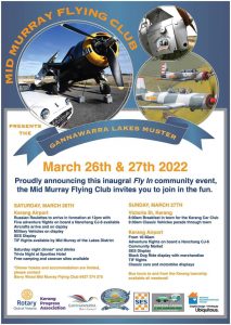 Gannawarra Aeroplane Muster 2022 THE YAKS ARE COMING! see the Russian roulettes on Saturday and Sunday 26 and 27th of March at Kerang airport flying their radial engined yak trainers. Cars and bikes on display don't miss our breakfast get together in Victoria street Kerang between 8am and 10am followed by a cruise to the airport for a display! Image: Phil Buckley EVENTS ON THE MURRAY – CREATING A REVOLUTION FOR TOURISM, TOURS, CONCERTS & EVENTS ON THE MURRAY RIVER!!!